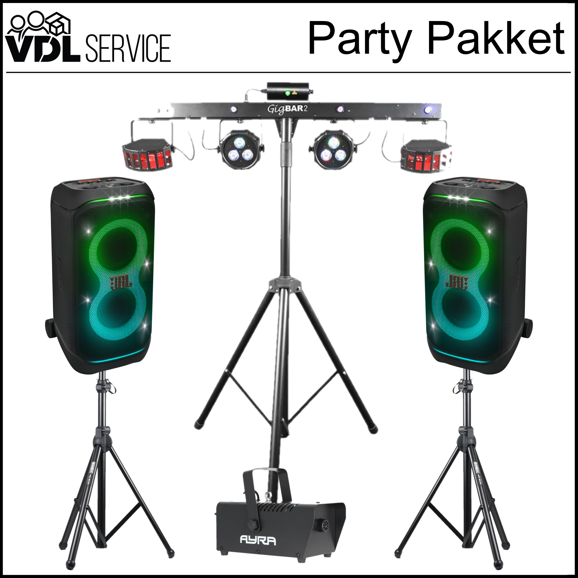 2x JBL PartyBox 320 + Lichtbalk met laser + Rookmachine + Statieven.