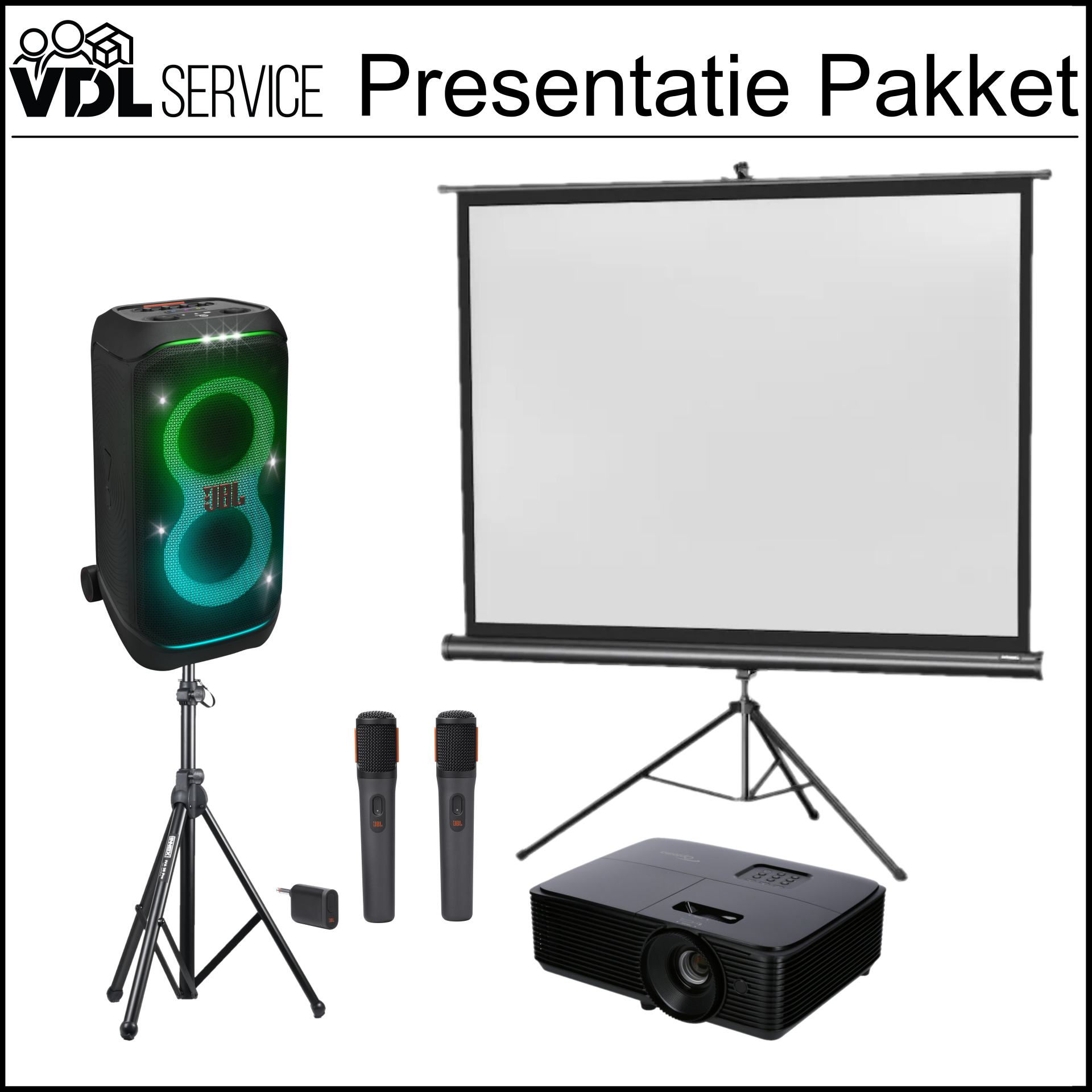 JBL PartyBox 320 + Beamer + Screen (60 inch) + Draadloze Microfoons + Benodigde statieven.